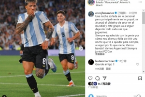 “永远感激球迷们对我们的支持,很高兴经历一个将被永远铭记的夜晚。让我们为接下来的挑战将继续努力!加油,兄弟们!加油,阿根廷!永远团结一致!”